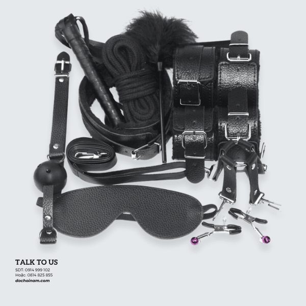 Bộ đồ chơi bắt cướp BDSM màu đen quyến rũ gồm 10 món phụ kiện hot nhất trong thế giới tình ái: xích tay, xích chân, bịt mắt, kẹp vú, roi da, chổi lông, khóa miệng, dây thừng, nối dây thừng và xích cổ. Tất cả đều được chế tác từ da cao cấp, dây vải bền chắc, lớp bông mềm mại ôm sát làn da, mang lại cảm giác thoải mái nhưng vẫn giữ trọn tính kích thích.