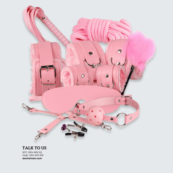 Bộ đồ chơi bắt cướp BDSM màu hồng gồm 10 món phụ kiện hot nhất: xích tay, xích chân, bịt mắt, kẹp vú, roi da, chổi lông, khóa miệng, dây thừng, nối dây thừng và xích cổ. Được chế tác từ da cao cấp kết hợp lớp bông mềm mại, dây vải bền chắc và khóa an toàn, sản phẩm vừa êm ái cho da vừa mang đến trải nghiệm bạo dâm mạnh mẽ.