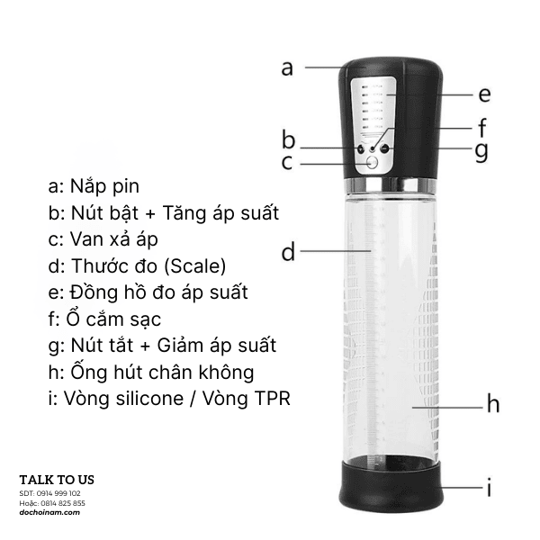 Máy được thiết kế với thân ống làm từ ABS bền bỉ, trong suốt, có thước đo chi tiết để người dùng dễ dàng quan sát quá trình tập luyện. Điểm nổi bật nhất là đồng hồ đo áp suất thông minh, giúp kiểm soát lực hút một cách chính xác, đảm bảo an toàn cho dương vật, tránh tình trạng sử dụng quá mức.